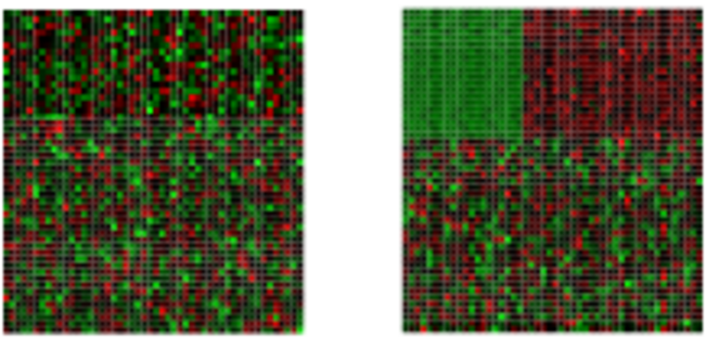 - A heatmap is a color coded table. To visually identify patterns, the rows and columns of a heatmap are often sorted by hierarchical clustering trees.