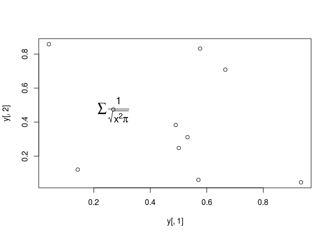 expression(sum(frac(1,sqrt(x^2*pi)))), cex=1.3)